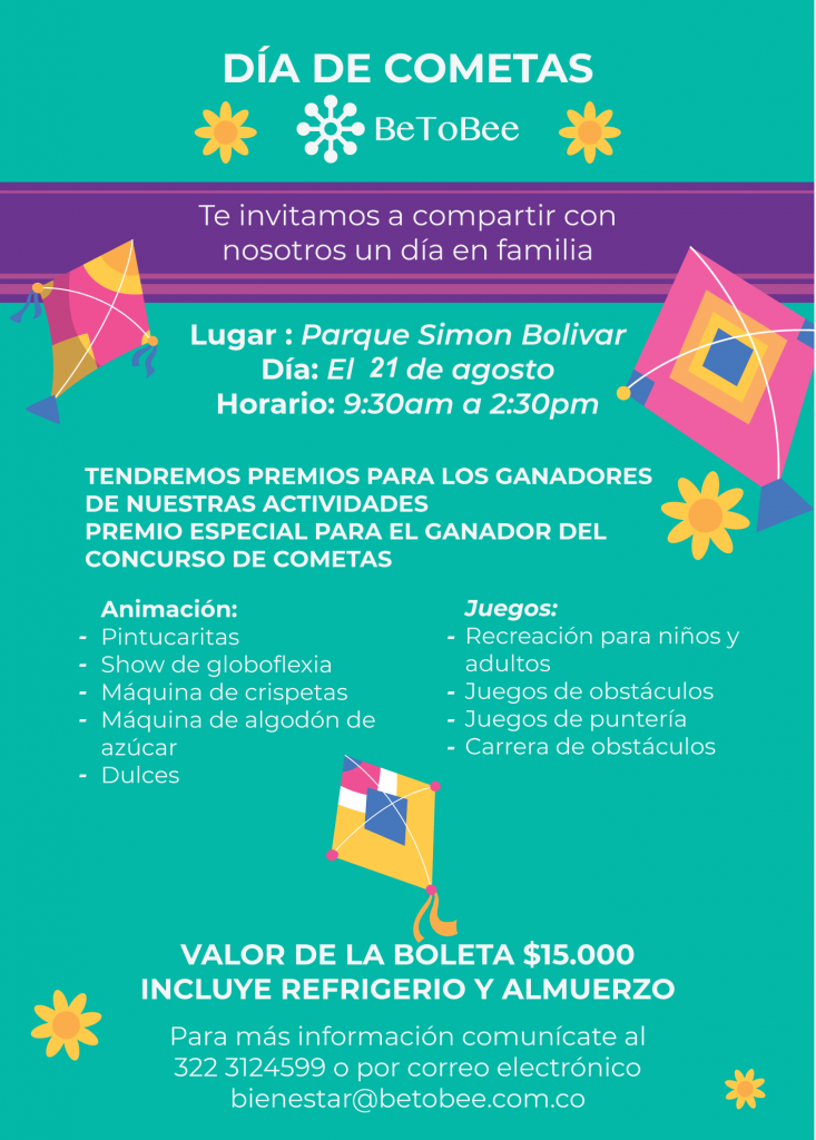 Apreciados colaboradores acompáñenos en este día tan especial junto con su grupo familiar y realicen sus COMETAS con toda la creatividad de la familia NOTA: SE PREMIARÁ, Creatividad, trabajo en grupo, y participación de actividades lúdicas VALOR POR PERSONA $15.000 DESCUENTO POR NOMINA (adjunto autorización de descuento)